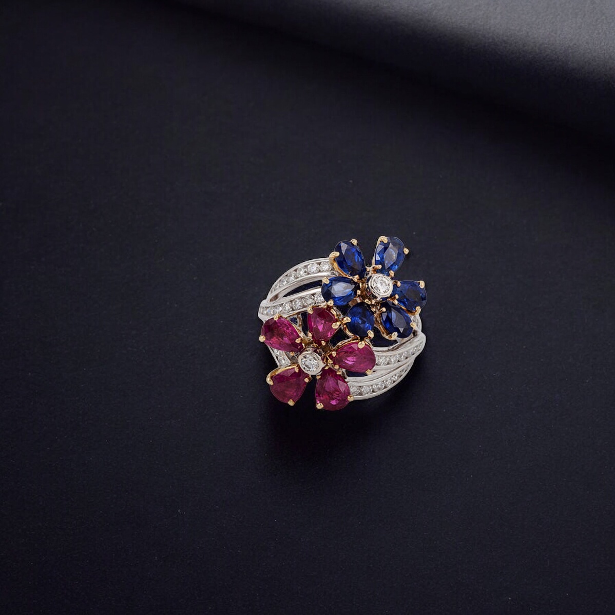 Questo anello nasce dall’amore per i fiori, meraviglie del Creato, esili e delicate, che sembrano esserci con il solo scopo di esser osservati nei loro colori e nelle forme dei loro petali. Due fiori, uno in gocce di rubini ed uno in zaffiri, entrambi in pear cut, che paiono esser colti in un abbraccio, con steli interecciati in oro bianco e brillanti