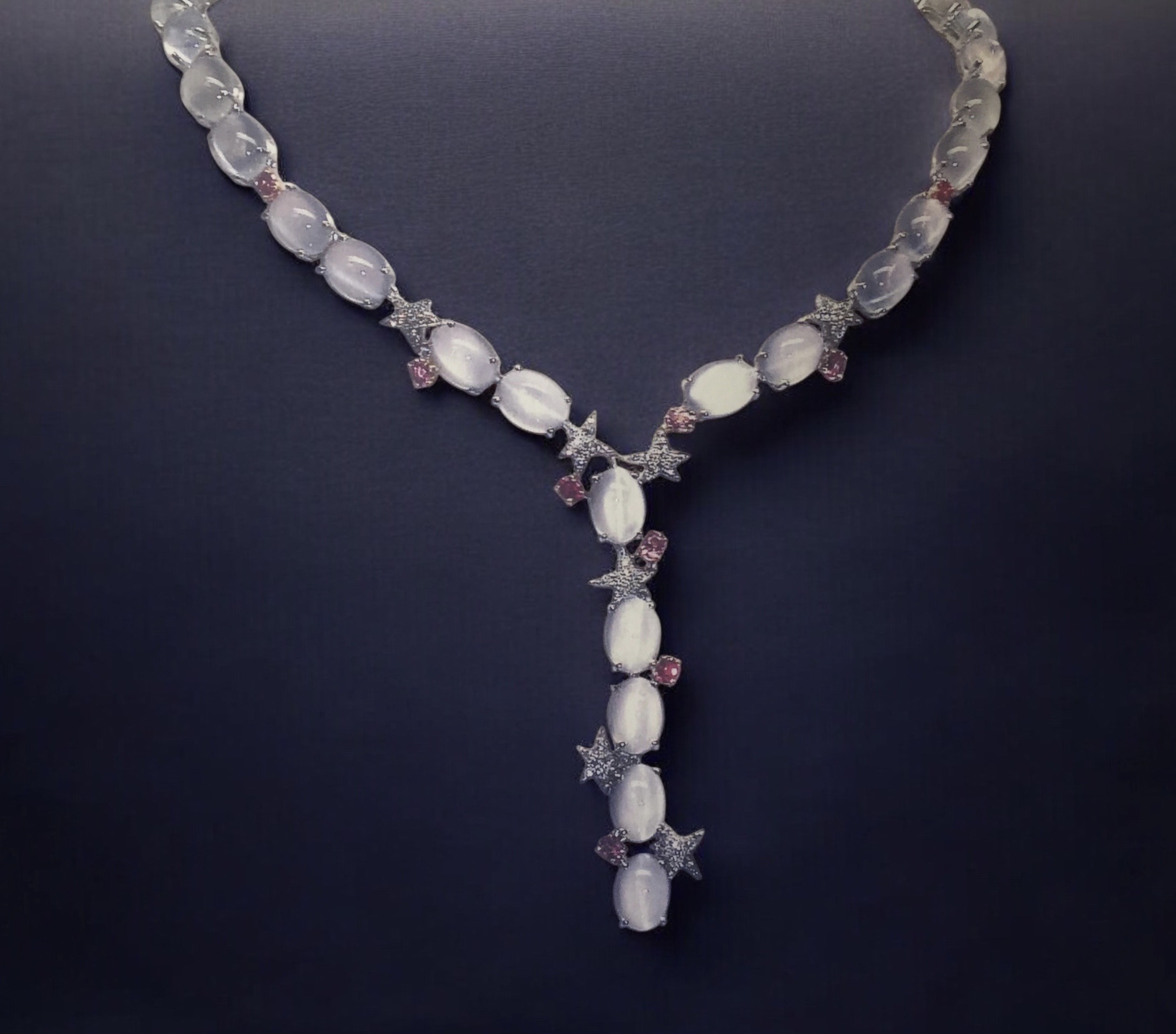 I claire de lune di taglio ovale cabochon si inseguono in lunghezza riservando spazio ad alcune stelle con diamanti taglio brillante e alcuni griffe con zaffiri rosa che aggiungono con tocco garbato una sfumatura nel dominante bianco.