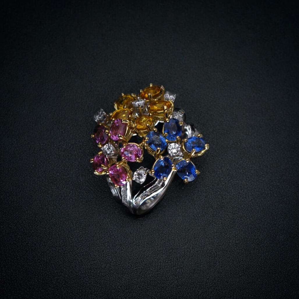 Come l’anello 2fiori, questo modello ne nasce come una naturale prosecuzione nata facendo spazio ad un ulteriore fiore. Una scelta che porta ulteriore colore senza eccedere nei volumi e ledere l’armonia preesistente.