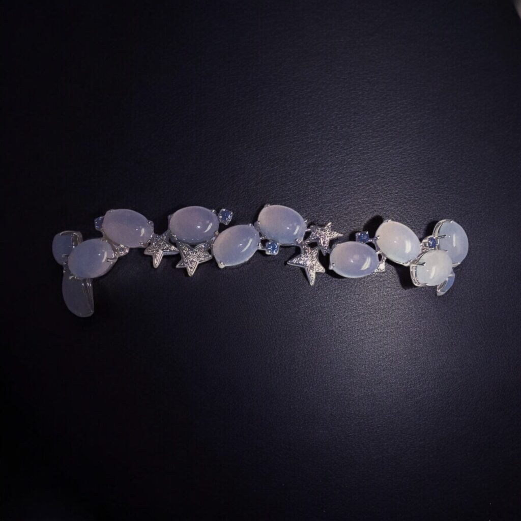Un set che si fonda sulla pacatezza di un colore, l’azzurro. Una tonalità delicata che regala raffinatezza e garbo. Il calcedonio, la gemma che dona alla vista questo colore, vive nelle forme morbide dei cabochon qui distribuite in modo generose nella collana ed equilibrate nel bracciale e negli orecchini. Stelle con diamanti con taglio brillante emergono in maniera disordinata portando luce e griffe con zaffiri jeans approfondiscono la sfumatura azzurra portando profondità alla collezione.