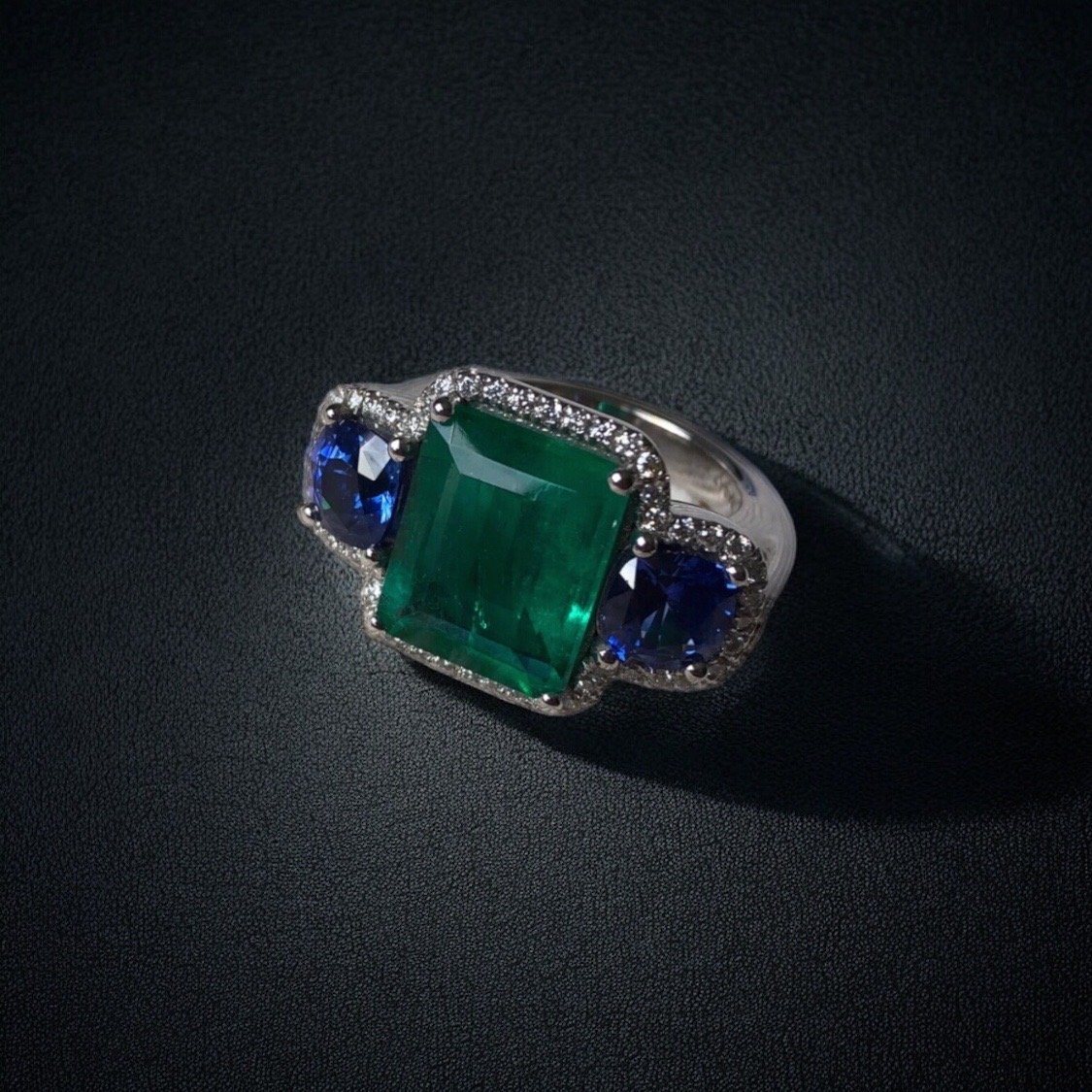 Ci sono colori che sono destinati a condividere la scena senza prevaricarsi, senza confondersi, senza rubare la parte altrui da recitare. Tra molti vi sono sono il blu e il verde, in mineralogia il corindone e il berillo, in gioielleria lo zaffiro e lo smeraldo. Ma non tutti i blu e i verdi. Solo il verde colombiano, per definizione il più pregiato, inconfondibile per colore e brillantezza, e lo zaffiro di una tonalità calda, scuro quanto basta per portare mistero ed intensità. Bastano loro per entrare in scena, solo alcuni brillanti gregari a ornarli in un anello elegante e di semplice efficacia per farsi notare.