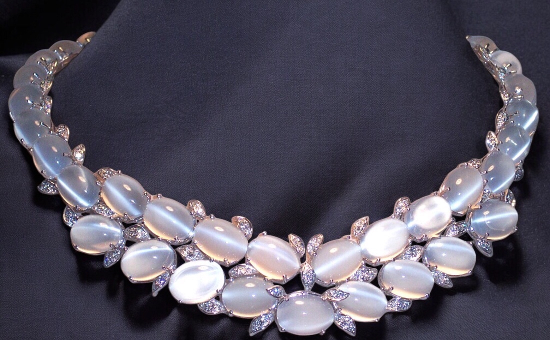 La collana è in oro bianco 18kt e con 40 Claire de lune cabochon e diamanti brillliant cut ct.2.04