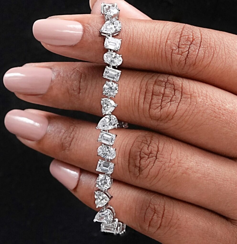 Ci siamo chiesti come si poteva derogare a questa semplicità, creando qualcosa di differente, che abbia in comune la successione delle pietre e la risposta è giunta osservando pietre di differenti tagli presenti sul tavolo. Disposte in orizzontale formando un treno fatto di vagoni irregolari, giocando con le disposizione delle diamanti ecco l’idea di un bracciale tennis che si ribella alle regole lasciando che non sia l’ordine a comandare ma un disordine organizzato.