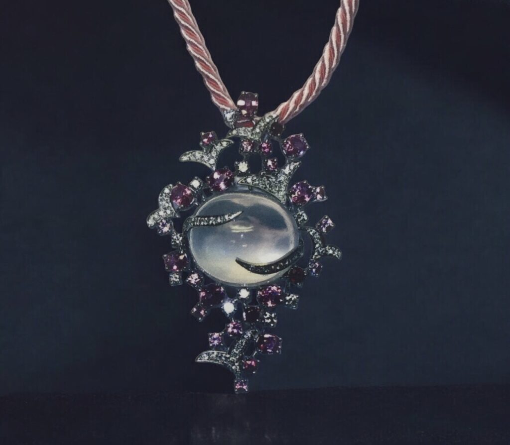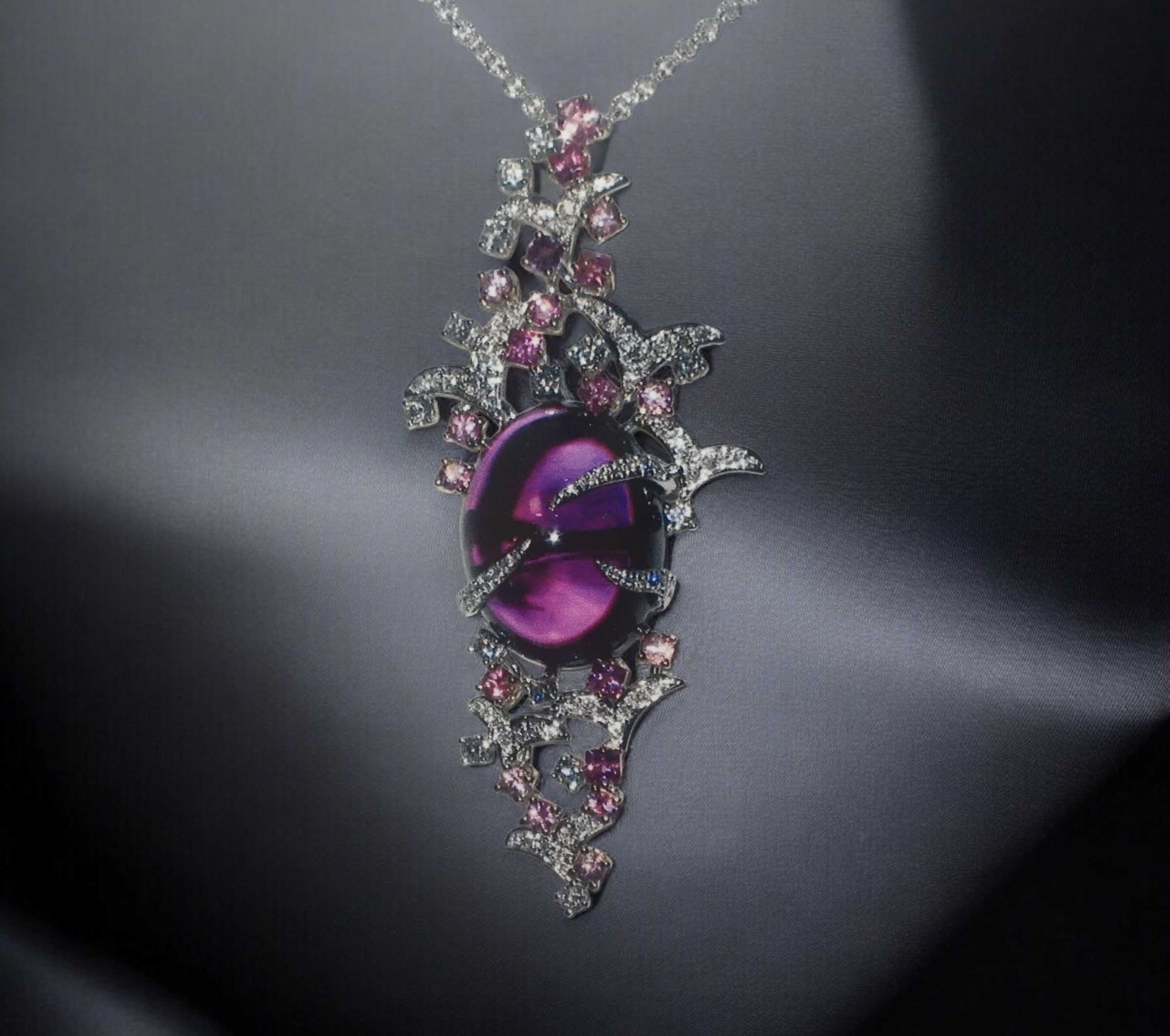 Intrappolare un tramonto in un gioiello, catturandone il colore caldo che macchia il cielo mentre dei gabbiani volano danno l’impressione di volerlo raggiungere oltre confini invisibili. A chi non è mai capitato di restare ammagliato dai colori del cielo in quel momento in cui mare e cielo si fondono in tonalità calde in un cielo per troppo tempo sobrio d’azzurro? Si resta lì a guardare questo quadro vivente che ogni giorno si ripropone ma mai uguale a sé stesso. Questo gioiello accoglie queste emozioni in un tramonto ametistato. Zaffiri rosa e diamanti donano vivacità e scintillio e il colore purpureo di un’ametista cattura il suo spazio al centro come il sole nel cielo.