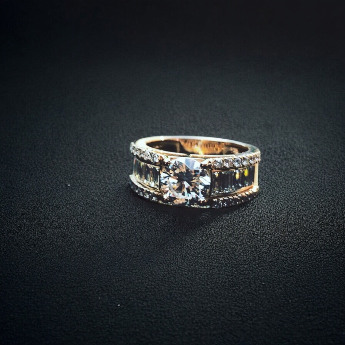 Come gli orecchini anche l’anello ripercorre la stessa filosifia, un contrato tra un concetto sferico eil concetto piu squadrato come enfatizzato dai diamanti taglio baguette che si muovono incassate a binario lungo la fascia.